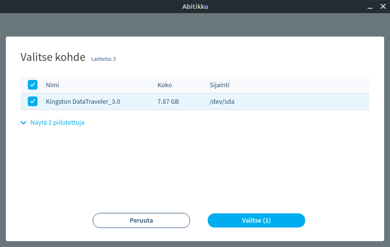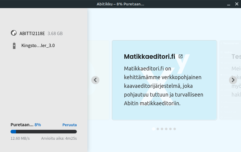 Abitikku is a powerful Abitti flasher built with web technologies to ensure flashing a USB drive is a pleasant and safe experience. It protects you from accidentally writing to your hard-drives, ensures every byte of data was written correctly and much more.