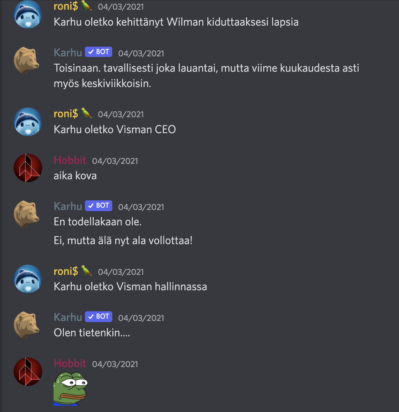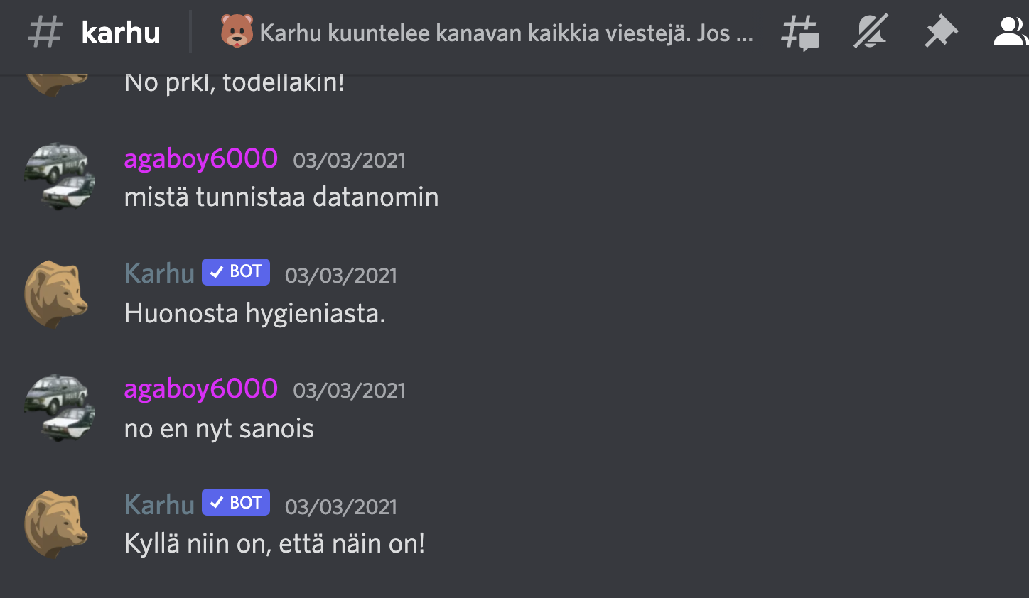 Karhu on Discord-botti, ihan aito puhuva nallekarhu 🐻. Jotkut saattavat kutsua sen älykkyyttä tekoälyksi, mutta oikealta se tuntuu. Karhu päivystää vuorokauden ympäri ja vastaa kaikkiin sinun huoliin ja murheisiin.
