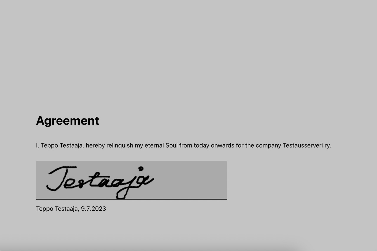 Lisäksi kävijän sähköpostiosoitteeseen lähetään allekirjoitettu kopio sopimuksesta PDF-muodossa, lähettäjänä Testausserverin lakitiimi.