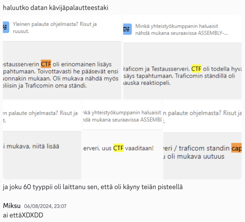 Miksi? Viime kesänä Assembly-tapahtumassa Messukeskuksessa pääsimme hallituksen ja vapaaehtoisten kanssa vastailemaan kävijöiden kysymyksiin: “Tekö olitte sieltä Testausserveriltä?” ja “Miten voi osallistua siihen CTF-kilpailuun”. Viime viikolla Suomen kyberin EM-joukkueen varsinaisessa karsintatilaisuudessa minulle aikaisemmin tuntemattomat naamat kertoivat esiintyessään olevan Testausserveriläisiä. Meidät tunnetaan ja me olemme suomalaisen tietotekniikan ja kyberin harrastamisen ytimessä.