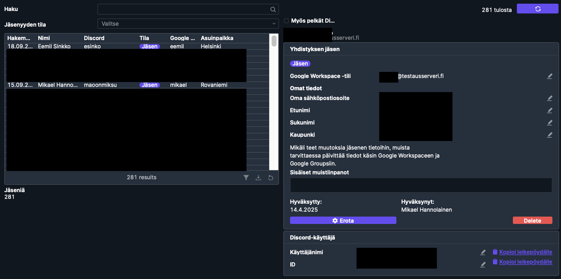 Mikael H. kehitti yhdistyksen jäsenreksteriä ja automatisoi prosessin. Nykyisin uudet jäsenhakemukset vastaanotetaan suoraan Testausserverin omalla lomakkeella, jossa hakija yhdistetään luotettavasti Discord-käyttäjänsä.