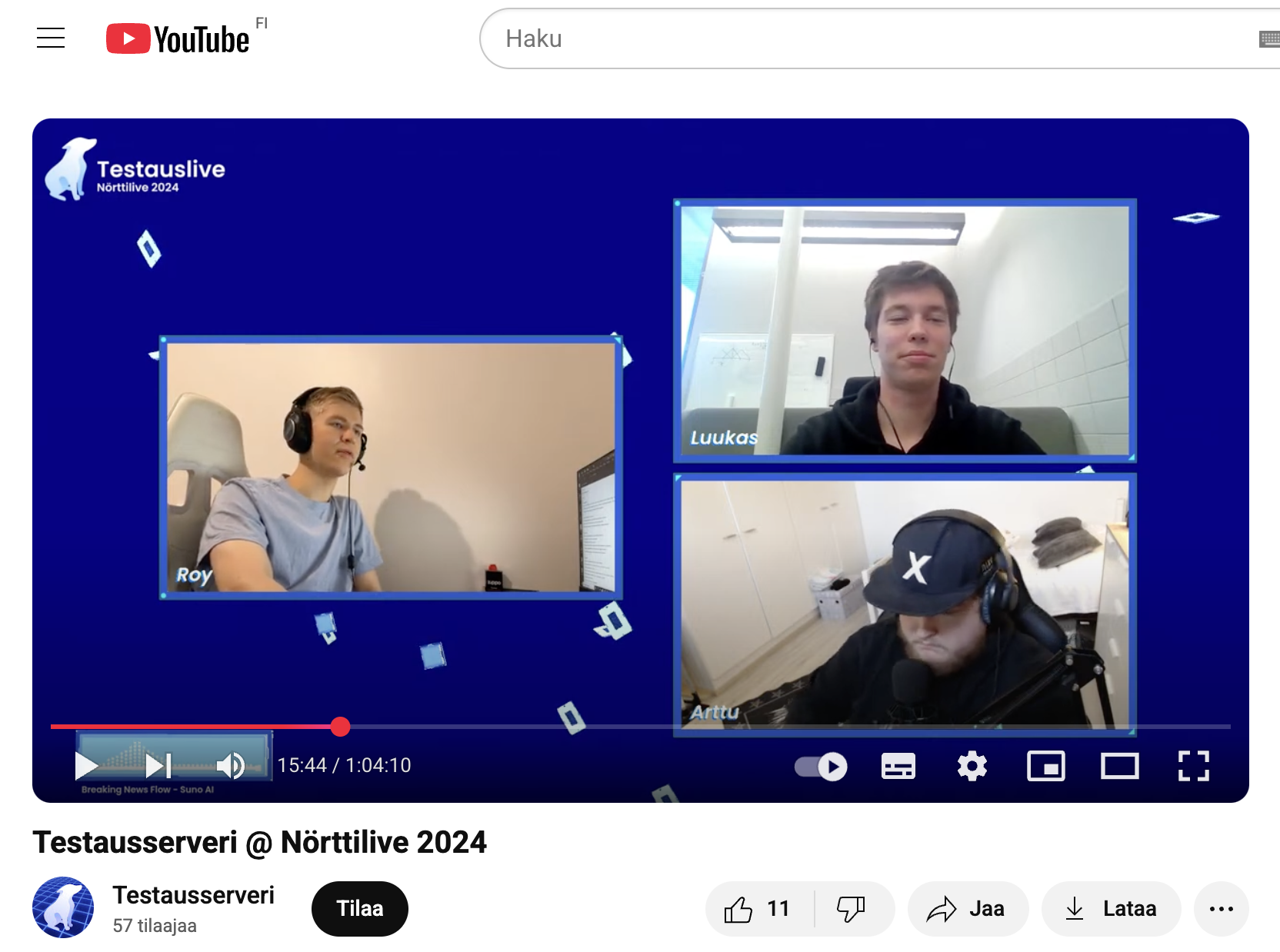 Testausserveri osallistui jo kolmatta vuotta peräkkäin Koodia Suomesta ry:n järjestämään Nörttilive-tapahtumaan. Tämän vuoden Nörttilive keskittyi erityisesti oppilaitosten tutustuttamiseen IT-alaan. Lähetyksessämme keskusteltiin muun muassa siitä, mikä koodaamisessa ja kyberalassa kiehtoo sekä millaista näiden alojen opiskelu on. Keskusteluun osallistuivat jäsenemme Roy T, Luukas P. ja Arttu J.