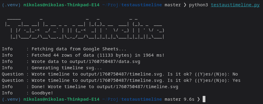 Aikajana luodaan käyttämällä Python-skribulaa, joka löytyy yllä linkatusta reposta, samoin kuin ohjeet sen suorittamiseen.