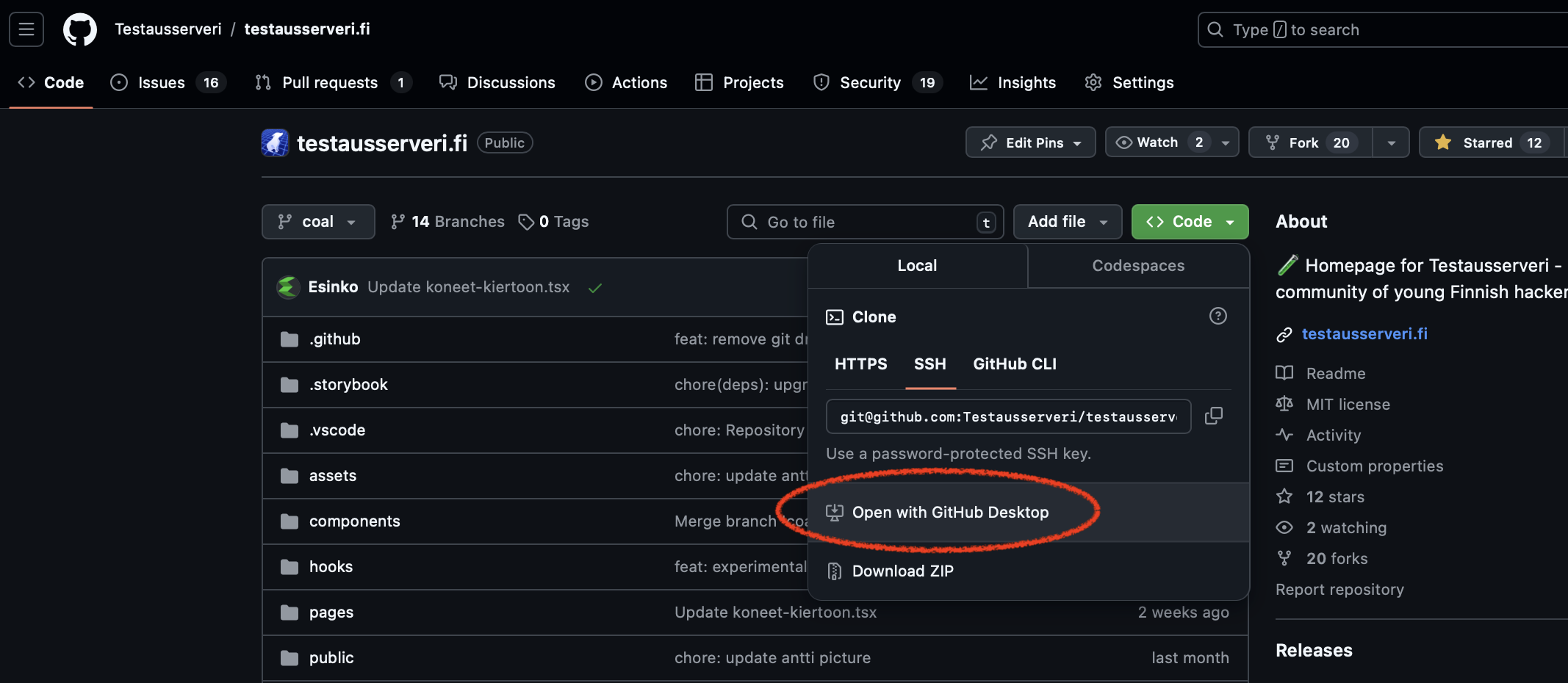 Kloonaa https://github.com/Testausserveri/testausserveri.fi. Helppo tapa on Githubissa painaa vihreää Code nappulaa ja sieltä Open with GitHub Desktop (kuva alla), joka opastaa kloonaamisen kanssa. Tai nappaa tästä komento: